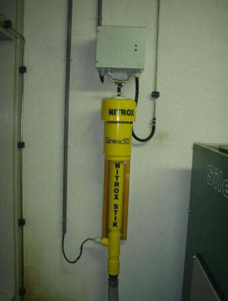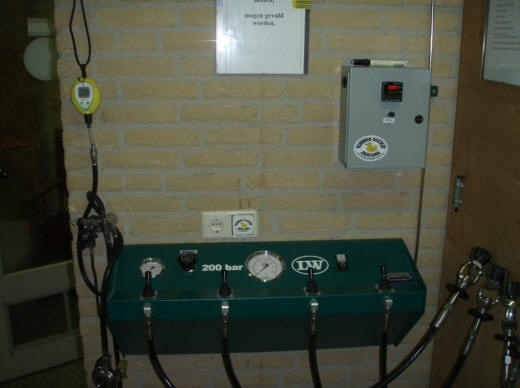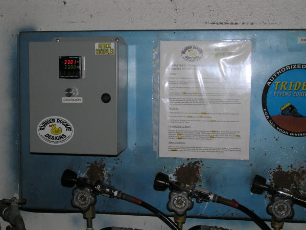 Nitrox Stik, Nitrox Safety Valve and oxygen supply located adjacent to compressor. Nitrox on/off switch and Maxtec oxygen analyzer located on wall.