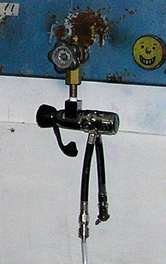 Picture of Nitrox Fill Station. The fill whips hang from the ceiling at tank valve height, making for faster hookups with less bending. My aching back appreciates this kind of thinking...